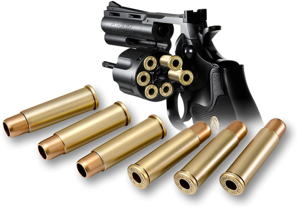 サイズ/仕様:全長:292mm、銃身長135mm、重量:440g(空のカートリッジをセットした場合)、弾丸:6mmBB(0.12g)、動力源:無し(手動)、装弾数:6発、種類:ハンドガン(リボルバー) セット内容:コルトパイソン本体、カートリッジ(6個)、安全キャップ、取扱い説明書、BB弾(0.12g/100発)、他