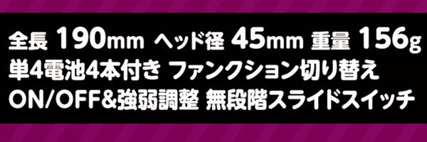 サイズ/仕様:パッケージ:22.8×16.3×5.5cm 本体:全長19.0cm ヘッド径4.5cm 重量:156g 電池:単四電池×4本使用