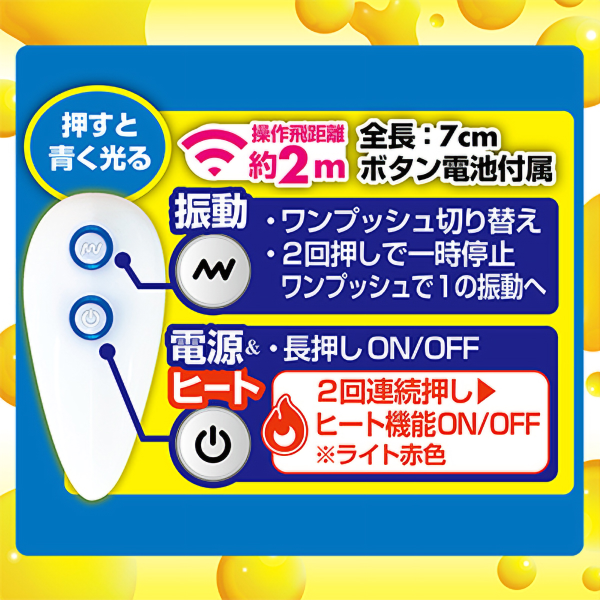 下着に仕込んでお散歩&お仕置きプレイにもオススメ♪動かさずに挿れっぱでLet’sイキっぱ!!!・ヒート機能付き・リモコン付属(操作飛距離約2m)・生活防水・USB充電式(充電時間:約120分/連続使用時間:約45分)