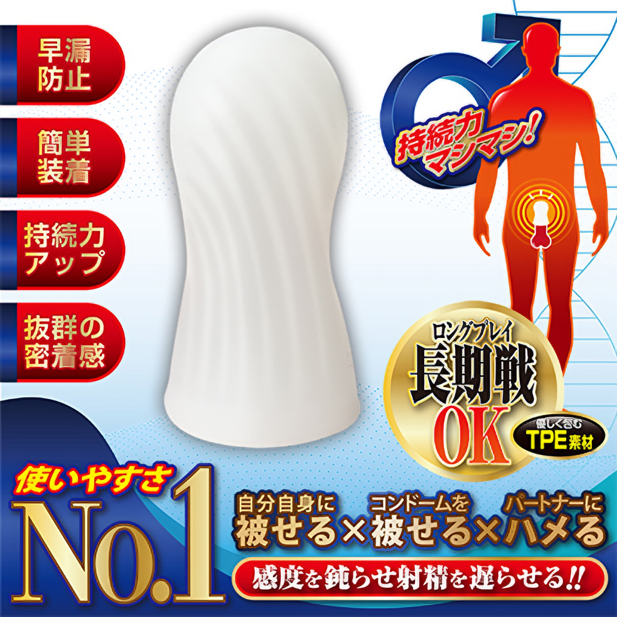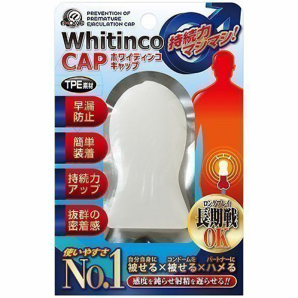 男の強いミカタ。夜のお助けサポートアイテム!!厚みのあるキャップが感度を鈍らせ、持続力マシマシで長期戦もOK。装着方法も簡単。キャップを自身に被せ、その上からコンドームを装着するだけ。フィット感も抜群で、どんなサイズにも対応。いつもより長く楽しみたい方におススメのお手頃キャップです。●TPE素材…伸縮性抜群で、どんなサイズでもぴったりフィット