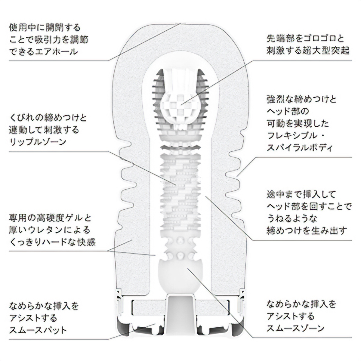 多くのユーザー様の声に応えて更に愛される「TENGA」としてリニューアル!蛇腹からネジのようなスパイラル形状にしたことで、より連続締め付けを体感できるようになりました♪内蔵されていたボールはダイレクトに先端刺激を味わえる大型突起へ変更。