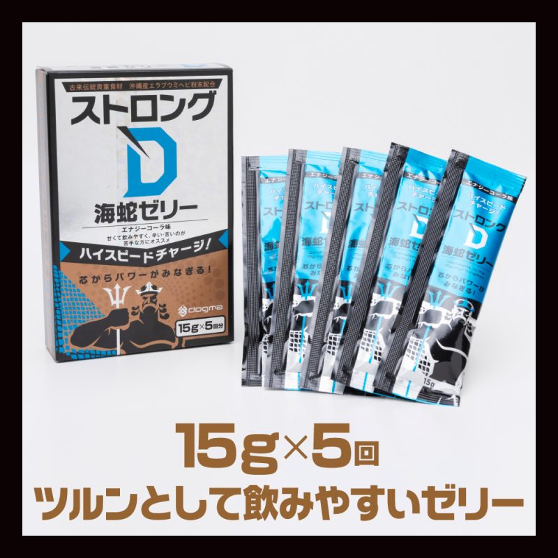 ハイスピードチャージで芯からパワーがみなぎる!琉球地方古来より、伝統的高級食材として珍重されたエラブウミヘビの圧倒的な滋養力を基に開発された、大人気「ストロングD海蛇」シリーズからゼリーverが登場!アミノ酸42種類・ビタミン・ミネラルが豊富なウミヘビ成分&相性の良い厳選成分に「マムシ抽出液、タツノオトシゴ抽出粉末、亜鉛含有酵母エキス、アルギニン」を贅沢に組み合わせて配合。